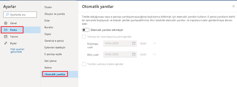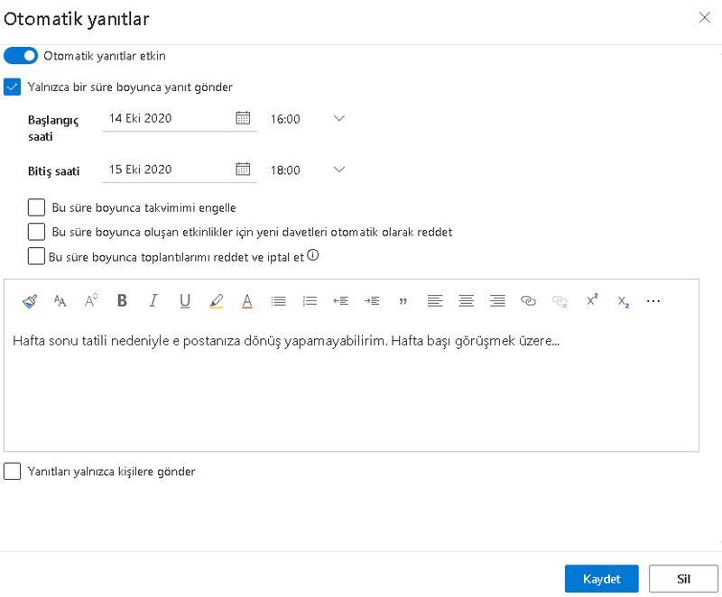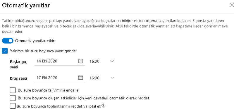 İzin, tatil veya hafta sonu için bu yöntemi kullanıyorsanız bitiş tarihinden erken dönerseniz otomatik yanıtları etkinleştir kısmını pasif hale getirmelisiniz.