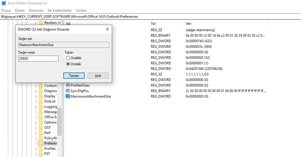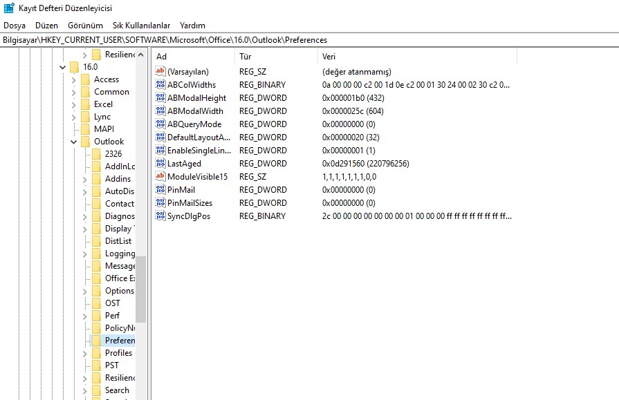 - Outlook 2019 ve 2016: HKEY_CURRENT_USER\Software\Microsoft\Office\16.0\Outlook\\Preferences
