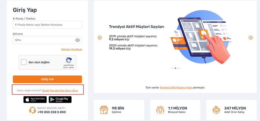 Adım 1: İlk olarak Trendyol partner giriş için yukarıda verdiğimiz bağlantı adresine gidin.