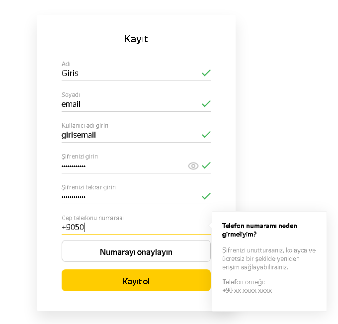 5 – Cep telefonu numaranızı girin. Şifrenizi unutmanız durumunda cep telefonunuza yeni şifre gönderilmesi için bunu yazmanızı tavsiye ederiz.