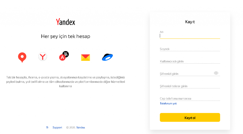 Yandex, en çok tercih edilen arama motorlarından birisidir. Arama motoru olmasının yanında mail hizmeti de vermektedir. Yandex mail adı altında ücretsiz e-posta servisi sağlamaktadır. Yandex uzantılı mail adresi almak için öncelikle Yandex üyeliğinizin olması gerekmektedir. Üyelik alarak yandex arama motorunun bütün servislerine erişebilirsiniz. Haritalar, disk, mail gibi bir çok ücretsiz servisi kullanabilirsiniz. Aşağıdaki adımları izleyerek kişisel hesabınızı açabilirsiniz.